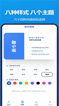 2、8套商务主题+8种配色随便点,引擎实时渲染,手机屏再大再小都不跑版,一键换色就能拍出高颜值名片。