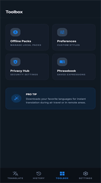 3、翻译记录存在本地加密库,可随时一键清空,也支持导出为 TXT 供自己备份,云端零上传,换手机用二维码隔空搬家,隐私不经过任何服务器。
