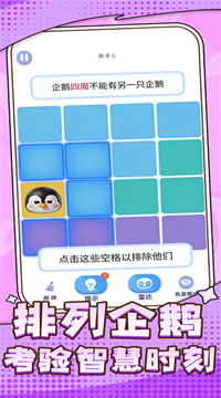《轻松闯万关》是一款规则极其简单但越玩越上头的佛系解谜游戏,核心就是在一个棋盘上摆企鹅,保证每行每列都恰好只有一只,没有时间限制也不拼手速,随时能开随时能停,让你在安静的思考中慢慢清空烦恼。