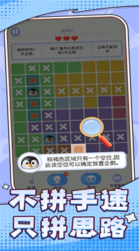 1、 游戏的基本规则特别简单好记,就是在一个方方正正的棋盘上摆放企鹅,但有一条铁律必须遵守:每一行和每一列里面,最终都只能有且仅有一只企鹅,多了不行少了也不行,你需要通过逻辑推理来找到每个企鹅该站的那个唯一正确的位置。