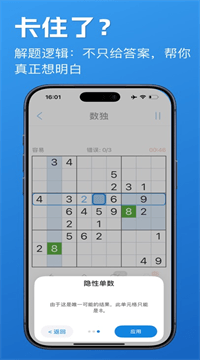 1、不只是刷题,而是真正读懂数独:很多数独App只给答案不给理由,这款App的每一步提示都附带逻辑说明,让你在解题的同时学会推理方法,玩一局就进步一点,越玩越聪明。