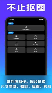 3、内置了图片工具箱,包括图片拼接、自由裁剪、修改尺寸、压缩图片大小以及格式转换等功能,抠完图顺便调一调,一张图从头到尾全搞定。