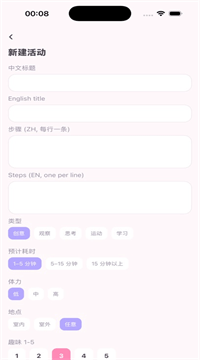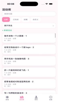 2、活动库像逛超市:顶部搜索框敲“宅”“户外”“2分钟”都能秒出结果,侧边筛选把“零成本”“不社恐”“坐着就行”全打上了标签;嫌官方不够玩?右下角“+”自己写任务,上传封面、填步骤、设难度,保存后立刻混进随机池,越用越像你的私人百宝箱。