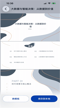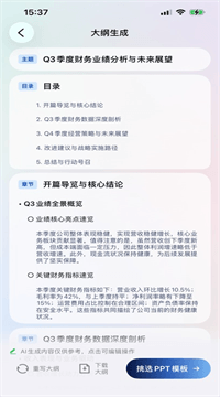 1、输入主题后AI先列骨架再填血肉,商务、学术、发布会模板任意切换,字体配色动画全配好,零设计基础也能直接上台。
