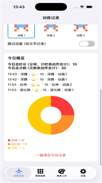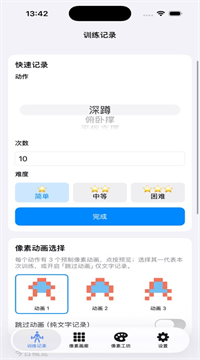 1、练完一组立刻点屏幕,次数、时长、难度、心情全记上,顺手挑个像素动画,数据实时进饼图,今天练了啥一眼看清,比手写省事儿多了。