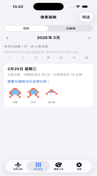 2、像素画廊能按动作、月份、难度、心情随便筛,日历一格一格点亮,动画墙刷刷滑,回看自己哪天偷懒哪天爆练,像翻童年游戏机存档。