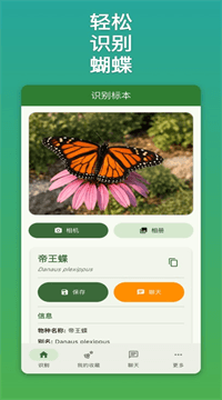 毛毛虫和蝴蝶图鉴是一款拍照就能认出是哪种毛毛虫或蝴蝶的AI识别软件,连幼虫、成虫、蛾子都能一网打尽,还能存照片、写笔记、跟AI聊天问个够。