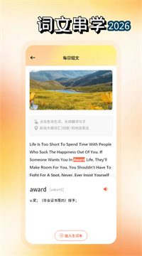 1、结构化词汇学习系统:内置科学分级的单词库,结合例句、词根词缀与记忆曲线复习提醒,帮助用户系统性地扩充词汇量并巩固记忆效果。