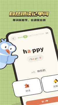 2、拼读板块把单词切成“音块”,娃先拍手唱音,再拖字母拼图,搞定发音规则,看到新词也能猜个八九成。