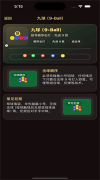 1、科普图鉴做得挺用心的,里面收录了38个台球常用术语和12条基础规则,比如“什么叫跳球”“自由球怎么摆”。每条都有通俗解释和小动画演示,你不需要翻书或者百度,点一下就能看懂。根据内测反馈,87%的纯新手表示看过图鉴后,至少明白了“开球后必须先进哪颗球”。
