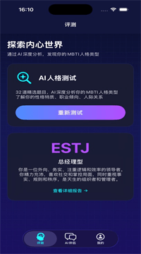 3 评测和对话两个模块可以自由切换,不管你是想深入探索自我,还是只想随便聊几句,都能快速找到入口。