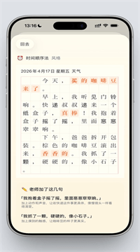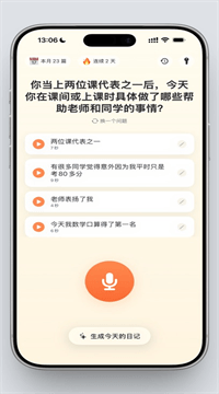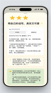 1、开口就能写日记:按住麦克风像讲故事一样自然说出今天的事,实时转写成文字;遇到卡壳时App会用年级合适的小问题引导孩子继续讲,一次可录多条,每条都能单独回放修改。