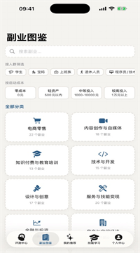 3、提供覆盖13大类副业方向的图鉴,可查看每个项目的启动成本、收益区间、风险级别、成长路径、获客渠道等详细内容,还有面向小白的技能学习路径,拆分为阶段性的知识点、案例和练习。