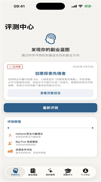 1、完成一套系统化评测,从职业兴趣、性格特质、时间与资源条件等多个维度建立个人画像,自动生成评测报告,帮你快速定位适合自己的副业方向,减少盲目试错。