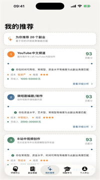 2、根据评测结果生成Top20推荐详情,包含匹配分数和维度分析,方便你系统比较不同副业路径,而不是只凭感觉做决定。