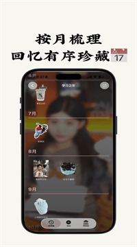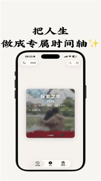 2、人生时间轴:按年份和人生阶段(童年、学生时代、工作、恋爱等)浏览你的藏品,每个阶段是一个展厅,滑动年份就能一年一年回顾你走过的路。