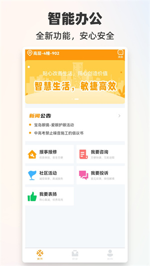 物业服务:用户可以方便地在线缴纳物业费、报修等,同时也能随时查看物业公告和社区新闻,让业主能够方便快捷地享受物业服务。