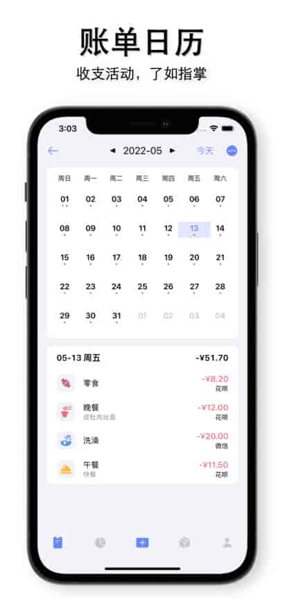 3、详细的账单日历,每笔收支活动,了如指掌。