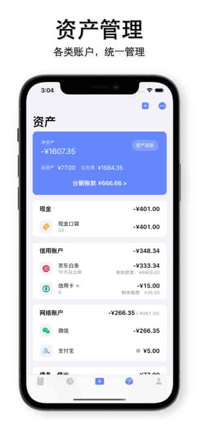 2、账户管理,资产账户管理、信贷账户分期管理、还款提醒、报销、债务。