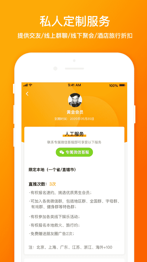 2、平台为超优质用户提供私人定制服务,提供交友、线上群聊、线下聚会、酒店旅行折扣等一条龙服务,为每对情侣带来一场浪漫的邂逅。