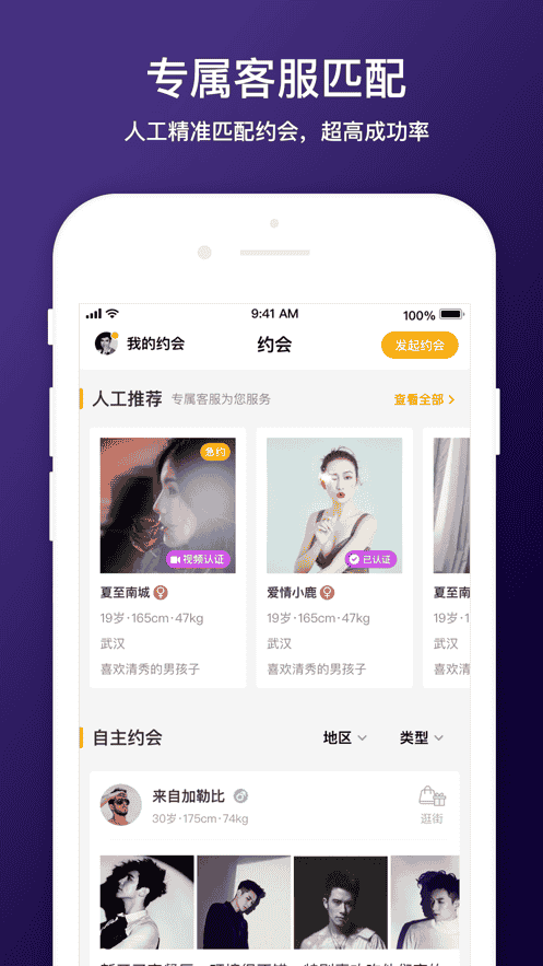1、每位用户都可享受专属客服匹配,平台人工通过您的喜好标签精准匹配用户向往的另一个TA约会,极高的成功率让众多用户在这里找到了真爱。