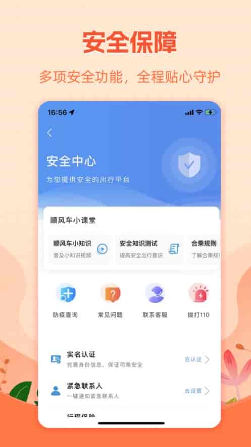 5、多种行程安全保障,紧急联系人,一键报警,亲友护航,保你出行无忧。