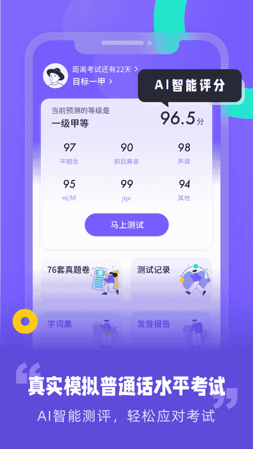 1、真实模拟普通话水平考试,AI智能测评,轻松应对考试。