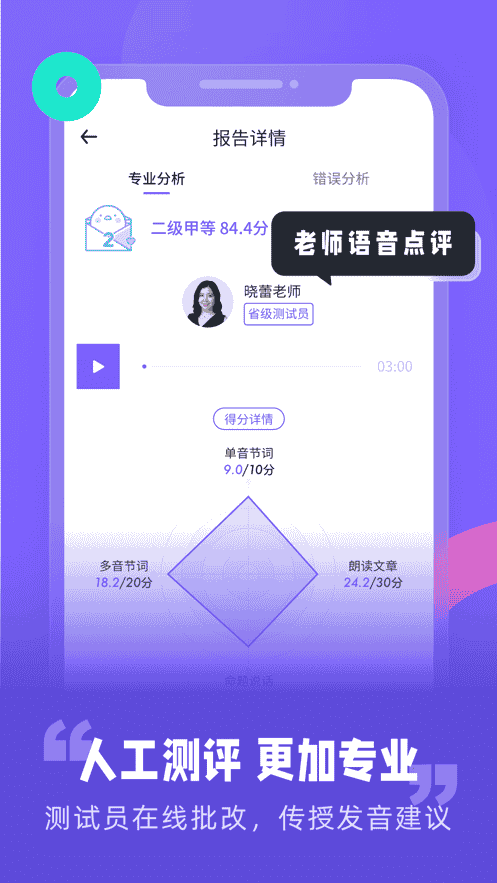 4、人工测评,更加专业,测试员在线批改,传授发音建议。
