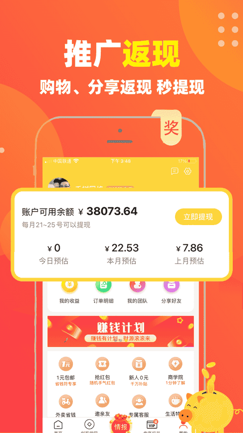 4、推广返现,购物、分享返现,秒提现。