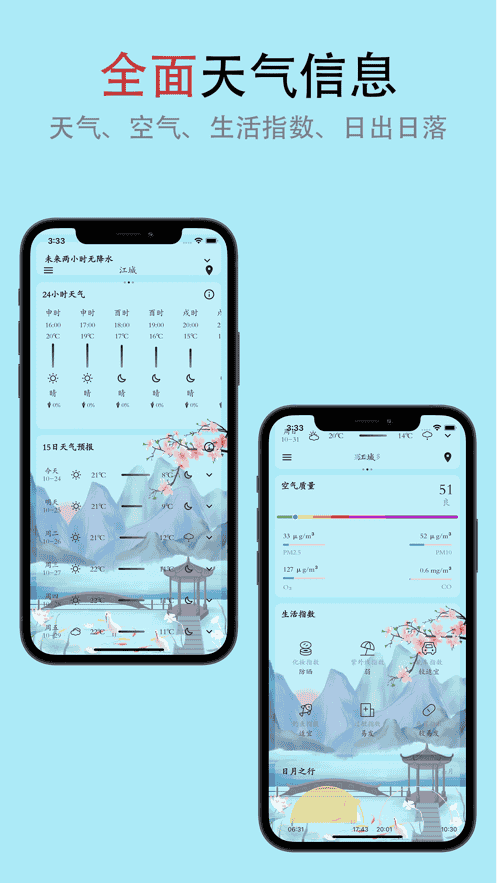 3、全面天气信息,天气、空气、生活指数、日出日落。
