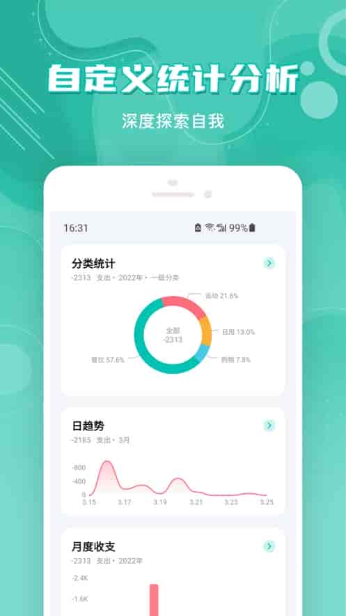 2、资产一目了然,收支统计,账户趋势了如指掌。