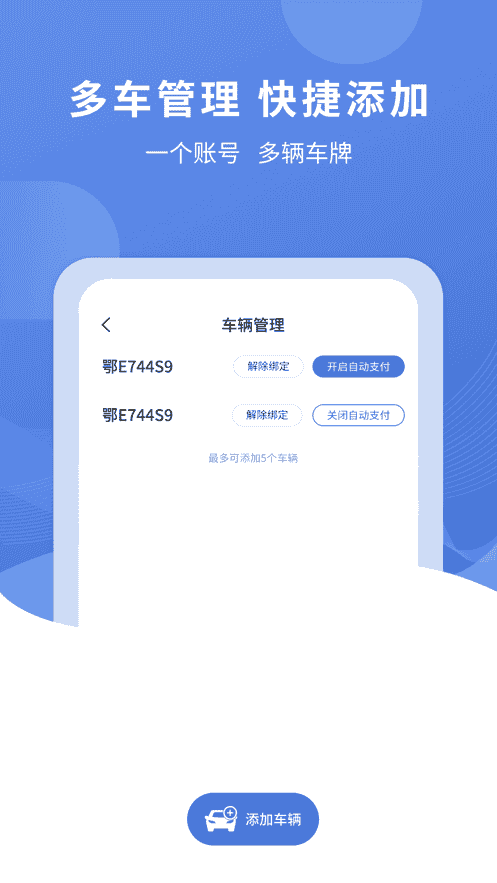 5、多车管理,快捷添加,一个账号,多辆车牌。