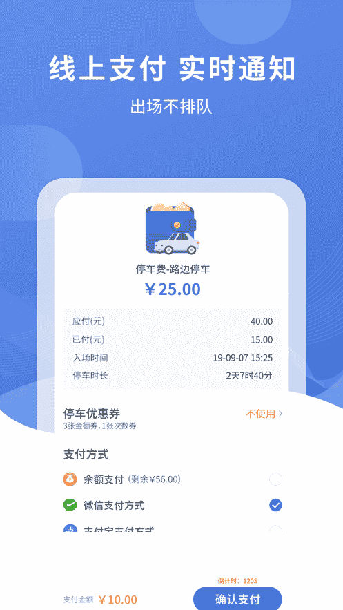 2、停车账单缴费,查询停车账单信息,无需岗亭缴费,动动手指轻松完成缴费。
