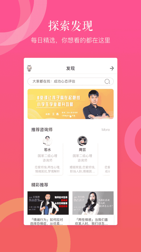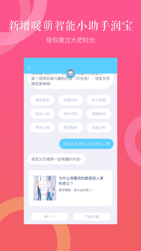 5、根据文章、问答等形式,了解心理知识,以及大众关心的职场、婚姻、人际等话题。