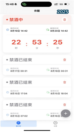 1. 智能药物计时系统:体醒App内置药物数据库,包含各类药物的药代动力学参数和酒精相互作用数据。用户输入药物类型和服用时间后,系统通过半衰期计算算法自动生成精准的安全禁酒时长,并在倒计时界面实时显示剩余时间。应用支持多药物同时监测,能够智能处理药物相互作用情况,提供最保守的安全建议。