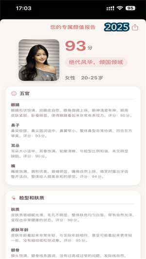 2. 专属颜值报告系统:平台生成AI之镜多维度颜值报告,包含AI之镜魅力值评估、AI之镜气质类型分析和AI之镜风格倾向诊断。通过AI之镜大数据对比和AI之镜美学标准参考,提供详细的AI之镜改善建议和AI之镜优势突出方案,帮助用户全面了解自身特点,发现独特魅力。