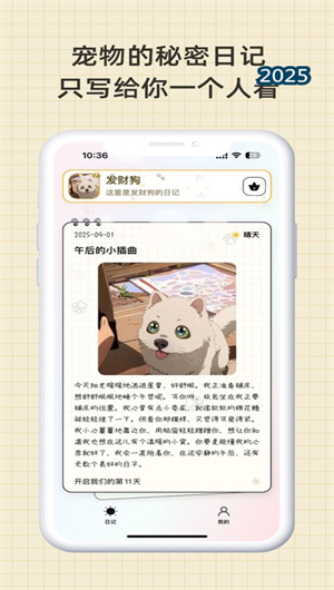2. 日记生成系统:基于自然语言生成技术与情感计算模型,专属萌宠每日自动生成手写风格的暖心日记,细腻记录与用户的互动点滴。日记内容涵盖清晨撒娇、午后慵懒、夜晚陪伴等多样化场景,系统通过情感语义分析捕捉用户互动时的情绪波动,并将其转化为宠物视角的温暖文字,使每篇日记都充满个性化治愈感,增强情感连接的深度与真实度。