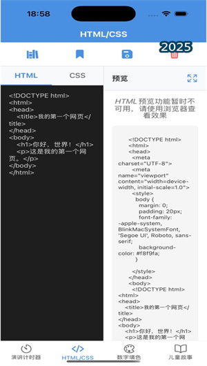 2. 代码预览编辑器:采用双面板交互设计的实时代码预览环境,左侧为支持语法高亮的代码编辑器,右侧为即时渲染效果展示区。编辑器集成HTML/CSS/JavaScript代码补全与错误检测功能,支持Emmet缩写语法与代码片段快速插入。所有代码修改实时同步至预览面板,无需手动刷新即可查看渲染效果,大幅提升前端学习与开发调试效率。