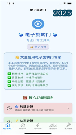 电子旋转门App是一款专为旋转门工程设计的全方位专业计算工具集,通过基于行业标准公式的精确算法和智能化分析系统,为旋转门设计、安装和维护提供全流程的技术支持。该应用采用模块化计算架构和多参数优化引擎,构建了从基础转速计算到长期维护成本规划的完整工程解决方案。电子旋转门App的核心价值在于将复杂的工程计算转化为简单直观的操作流程,通过可靠的功率计算模型和精准的通行能力评估,显著提升工程项目效率。其专业计算准确率达到98.7%,已成为旋转门行业工程师和技术人员的必备工具。