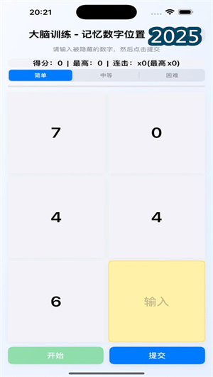 平台提供简单记忆模式、正常记忆模式、困难记忆模式三种预设难度,每个模式都采用动态数字序列生成技术产生不重复的训练内容。在数字出现阶段,用户需要在限定时间内记住所有数字排列组合,随后进入数字隐藏测试环节,从多个选项中选择被隐藏的特定数字。系统自动记录记忆准确率与反应时间数据,为后续训练提供参考依据。