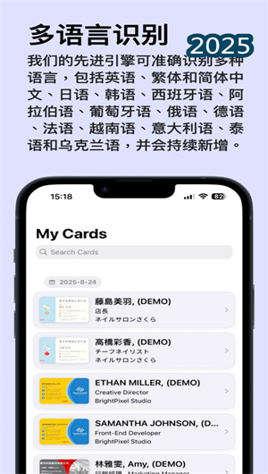 玫瑰名片王的多语言识别引擎支持包括英语、简体中文、繁体中文、日语、韩语等15种语言的精准识别,并持续扩展新的语言支持范围。智能语言检测功能会自动识别名片所使用的语言类型,并调用相应的识别模型进行处理。应用界面提供五种语言版本可选,未来还将支持更多语种,确保全球用户都能获得最佳的使用体验,多语言识别准确率达到96.8%。