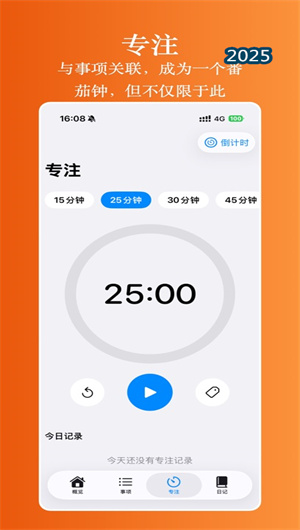 应用深度融合番茄工作法核心机制,提供智能的专注时段规划与打断管理功能。每个番茄时钟单元都配备完整的专注度评估系统,通过量化指标衡量用户的专注质量。创新的专注成果记录功能将每个番茄时段的工作成果与后续的情绪反馈相关联,而效率趋势分析则长期追踪用户专注力的变化规律,这些专业工具显著提升了用户的时间管理能力与工作效率。