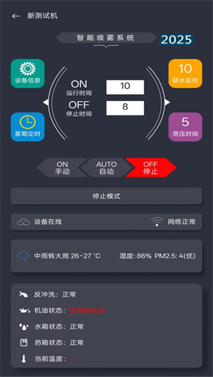 智能雾森的核心功能是其强大的远程启停能力与多机组网管理机制。用户可通过平台对分布在不同区域的喷雾设备进行远程控制,无需现场操作即可完成开关机指令下发。系统支持将多台设备纳入统一的设备组网架构中,实现集中管控,用户可在设备列表中批量操作或分组管理,极大提升了大规模部署场景下的操作效率。无论是单个设备的即时启停,还是整个设备网络的协同工作,均可通过这一一体化控制平台轻松完成,为园林景观、工业降尘等场景提供前所未有的管理便捷性。