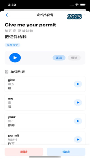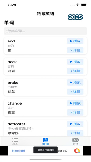 除了完整的句子指令,APP还提供专门的词汇学习模块。该模块收录了与驾驶考试密切相关的英语单词和常用短语,并按照车检词汇、路考词汇、交通标志词汇等专题分类进行组织。每个单词和短语都配有标准发音和中文释义,部分关键词汇还配有用法示例,帮助用户在掌握指令的同时,夯实基础词汇量,全面提升驾驶场景下的英语应用能力。