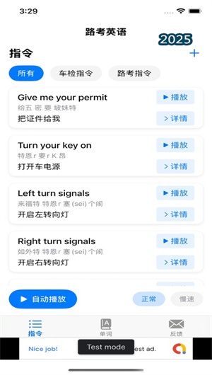 为优化学习效率,路考英文APP配备了自动播放功能,用户可以设定连续播放模式,让系统按顺序或随机朗读指令库中的内容。这种自动播放机制非常适合在碎片时间进行沉浸式学习,无形中强化了对指令的记忆巩固。结合科学的间隔重复原理,系统会智能推送未熟练掌握的指令,确保练习记忆的效果最大化,使得用户在通勤、家务等场景下也能高效备考,将时间利用率提升40%。