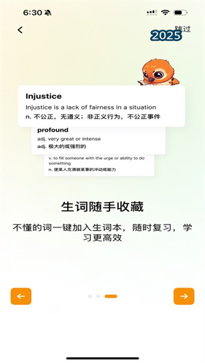 2. 上下文词汇学习与智能生词管理:本App最具特色的语境记忆功能,彻底颠覆了传统的单词背诵模式。在阅读过程中,用户遇到任何生词均可即时点击,系统将提供基于当前上下文语境的释义解析与例句展示,而非孤立的字典释义。被查询的单词会自动收录至用户的个人生词本,并进入系统的智能复习计划。该计划依据艾宾浩斯遗忘曲线原理,在最佳记忆节点通过原句回顾、词义匹配、填空练习等多种形式推送复习任务,确保词汇从短期记忆顺利转化为长期记忆。