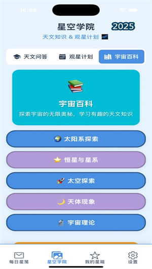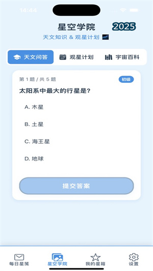 2. 阶梯化星空学院与自适应学习路径:本App构建了结构严谨的星空学院,其课程体系严格划分为初级、中级与高级三个难度阶梯,内容由浅入深覆盖星座神话、天体力学乃至宇宙学前沿。每个阶段均配有相应的知识问答用于巩固学习成果,并关联观星计划提供实践指导。用户可根据自身水平选择起点,系统会基于测试结果推荐个性化学习路径,确保学习体验既具挑战性又不会令人望而生畏。