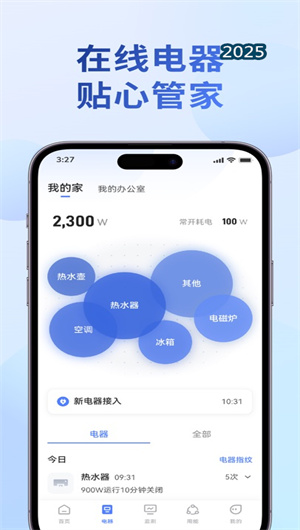 2. 非侵入式电器识别与个体能耗追踪:本App搭载了先进的电器指纹识别引擎,无需在每个电器上安装单独传感器,仅通过分析总路电流的谐波特征、启停瞬态与功率波形,即可智能辨识出家中正在运行的空调、冰箱、热水器等主要电器。系统会为每个识别出的电器建立独立的能耗档案,记录其运行时长、单次耗电量及待机功耗,为用户提供颗粒度极高的能耗透视视角。