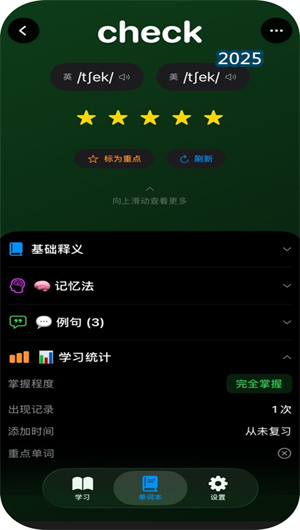 应用构建了一套精密的掌握度追踪体系。每个单词都引入了一个清晰的5星评级系统,用户可根据熟悉程度进行标记。系统会记录这些评级变化,形成每个单词的掌握进度曲线。基于这些数据,智能筛选功能可以快速筛出“薄弱词汇”或“已掌握单词”,让用户的复习更具针对性。这种数据驱动的复习机制,确保了学习精力始终能投入到最需要的地方,实现了真正的个性化学习路径。