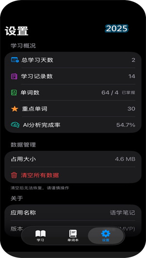 为了提供清晰的学习反馈,语学笔记配备了全面的学习数据统计仪表盘。它自动进行学习天数统计,以日历等形式激励用户持续坚持;同时动态更新词汇量追踪数据,清晰展示总词汇数与已掌握数量的对比。对于用户标记的重点单词,系统会单独计算其掌握进度。此外,AI分析完成率这一独特指标让用户对学习内容的智能化处理进度一目了然,确保了学习闭环的完整性与透明度。